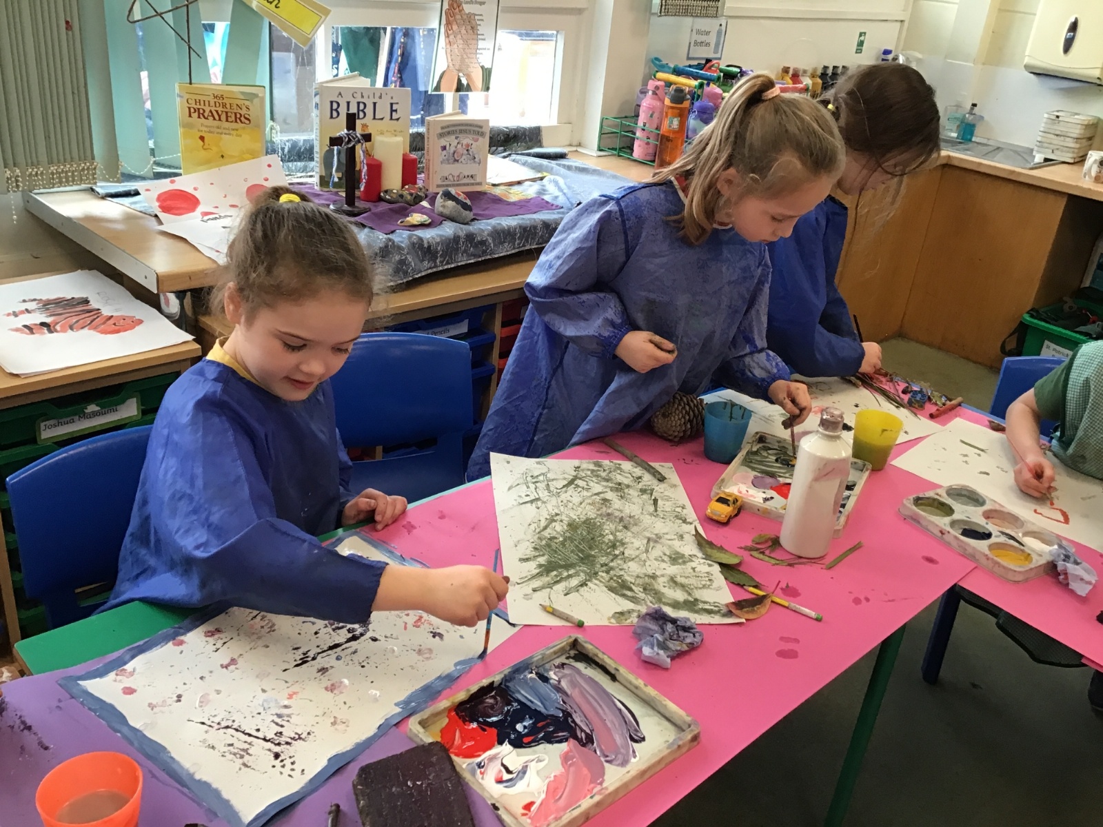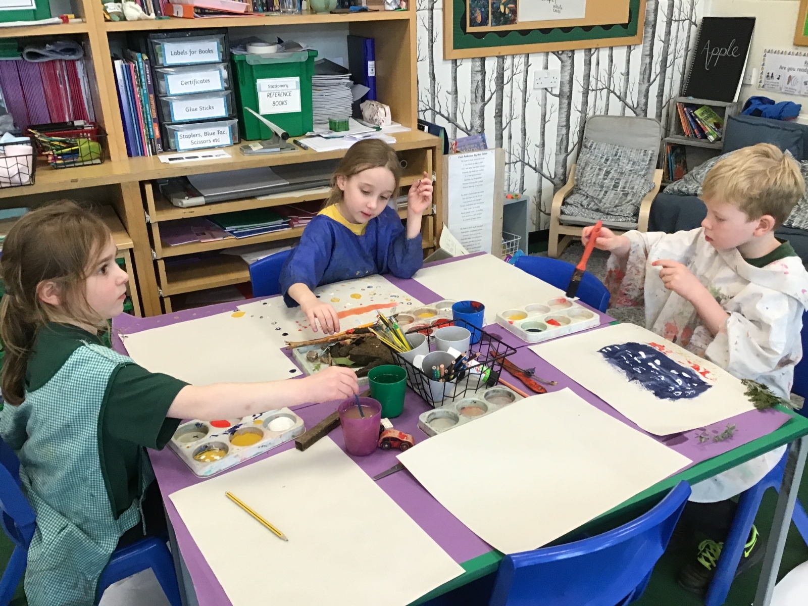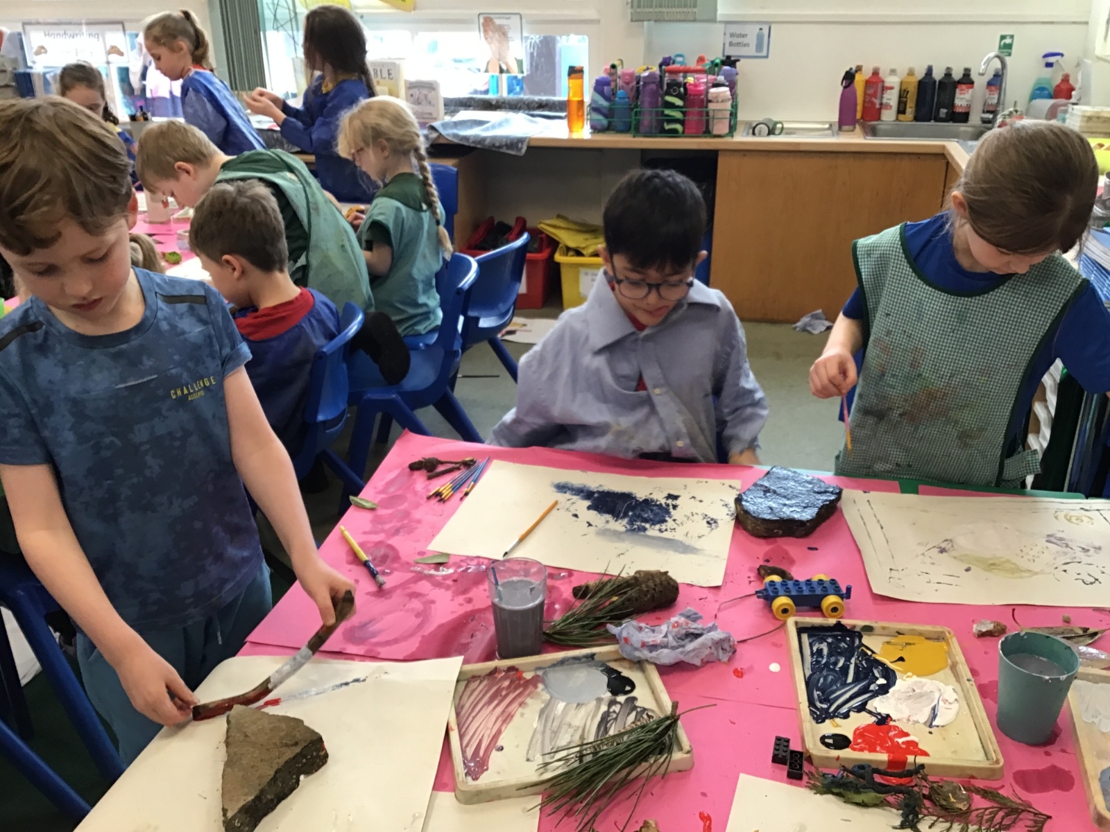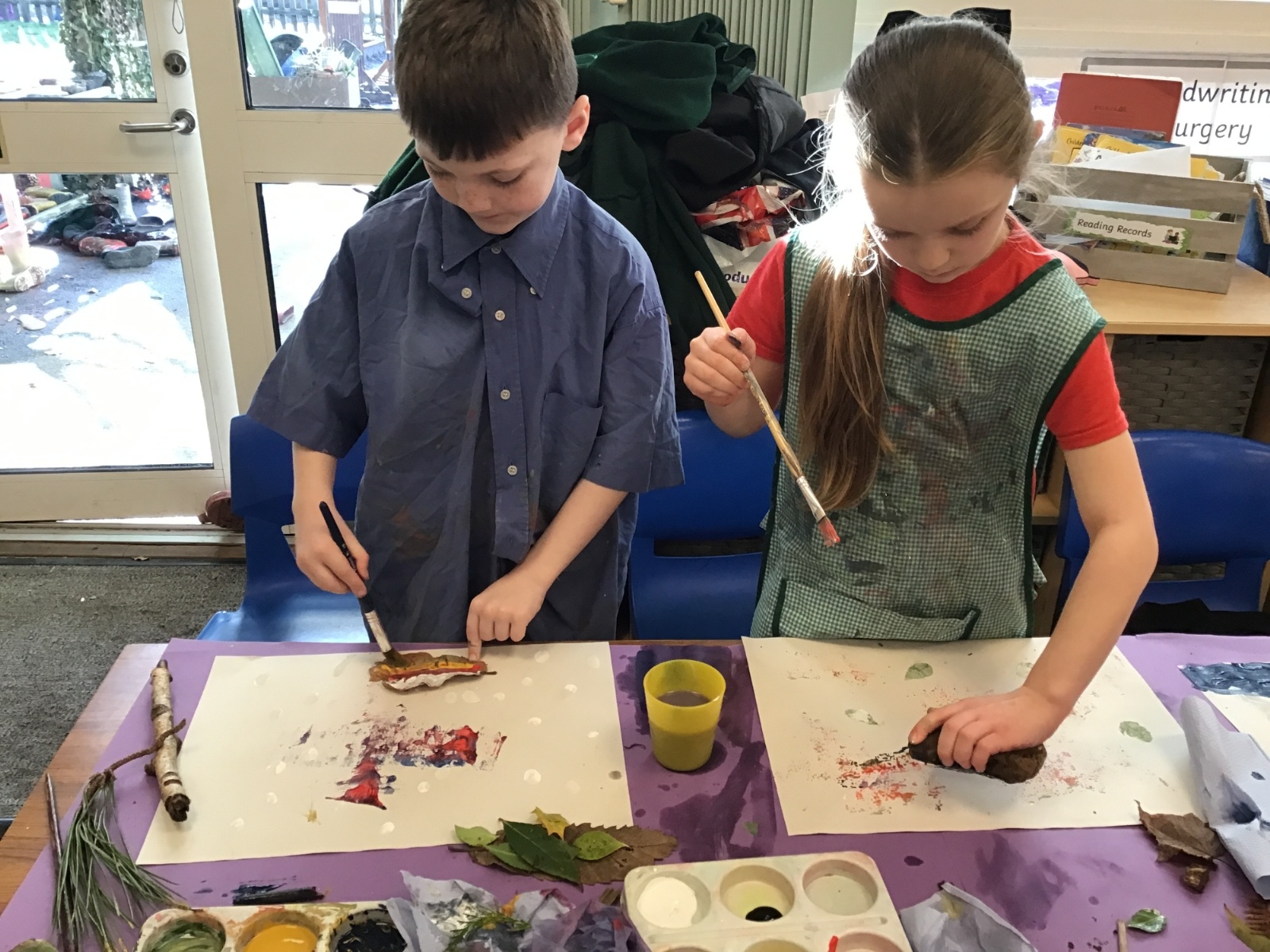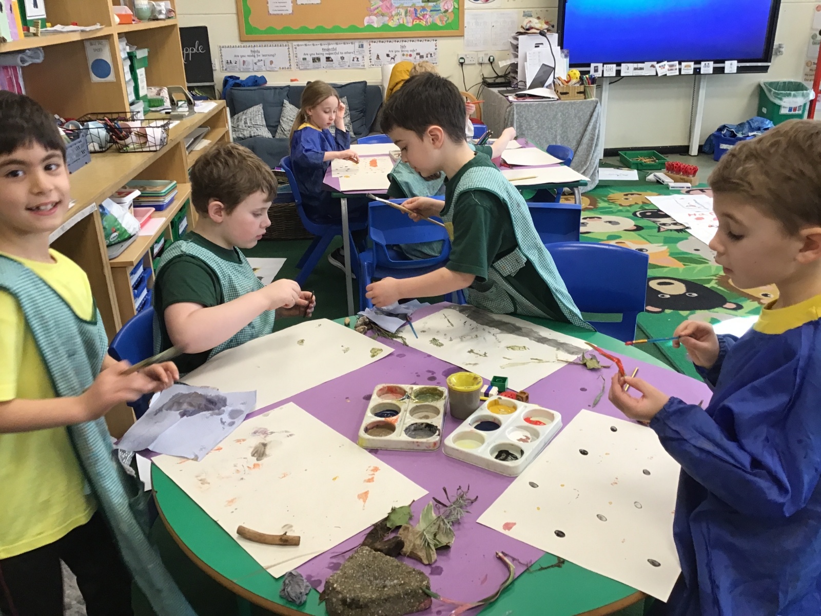 Today, Apple Class have been creating their artwork. They have used the work of Alex Artiste Pientre as inspiration, who uses everyday objects to print her backgrounds and then create real life paintings of animals in the background. Apple Class went on a hunt outside to find natural objects they could print. Then they painted their animals before mounting them.