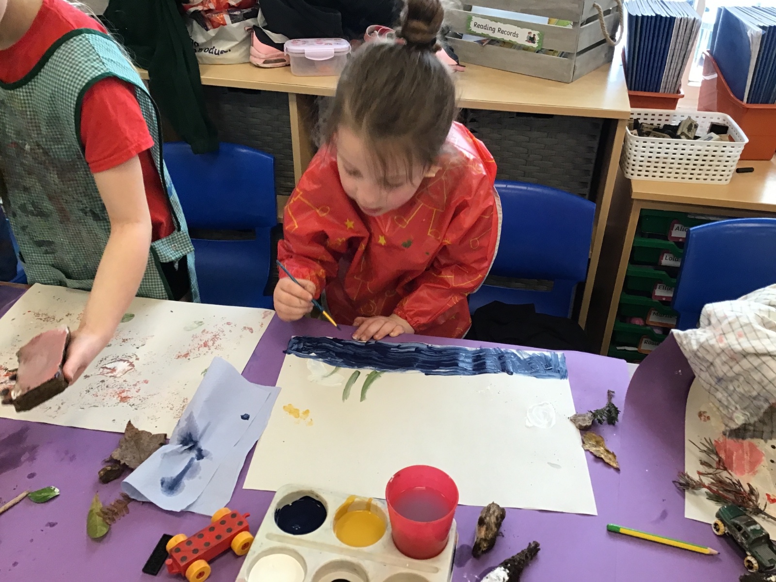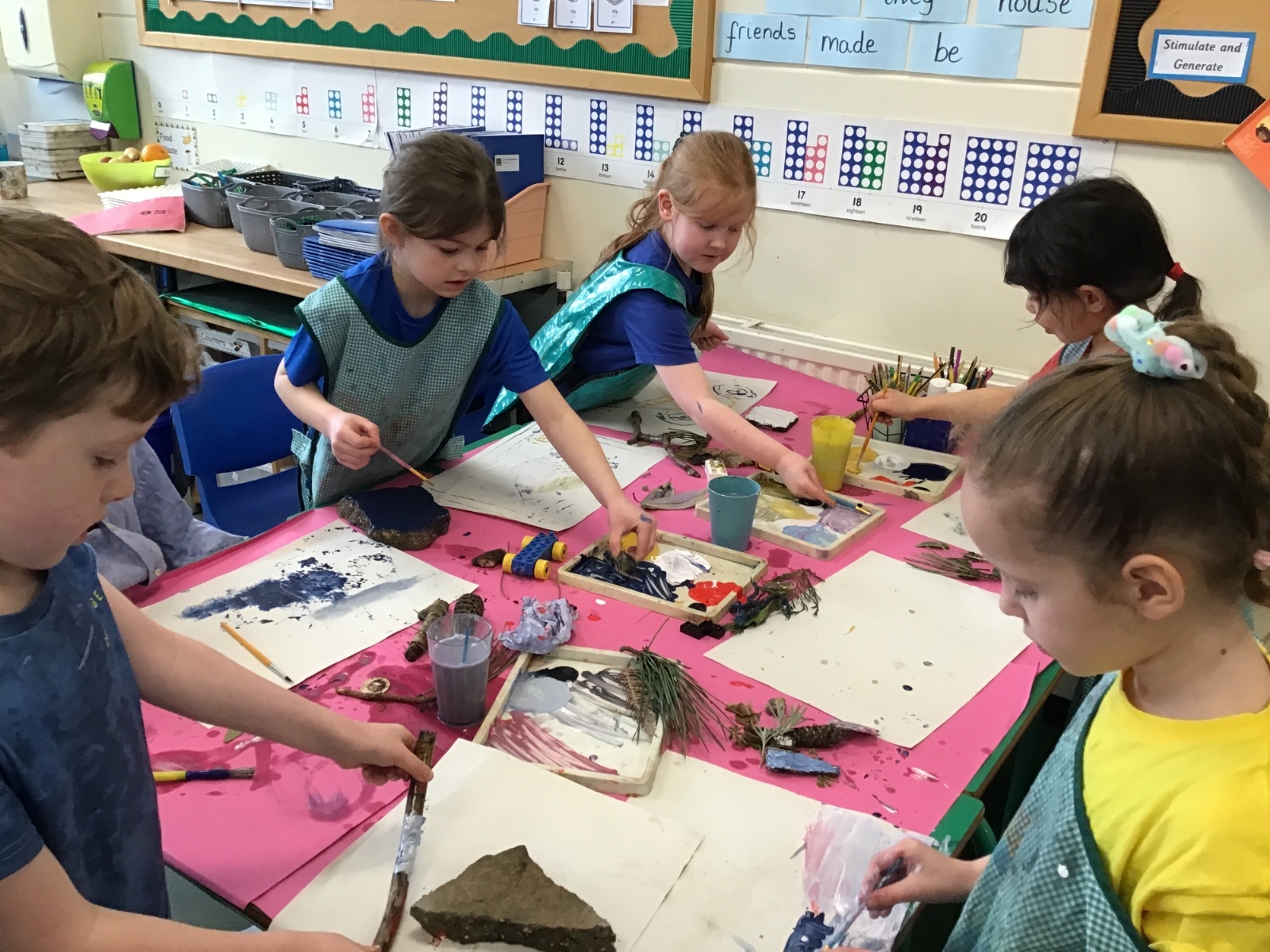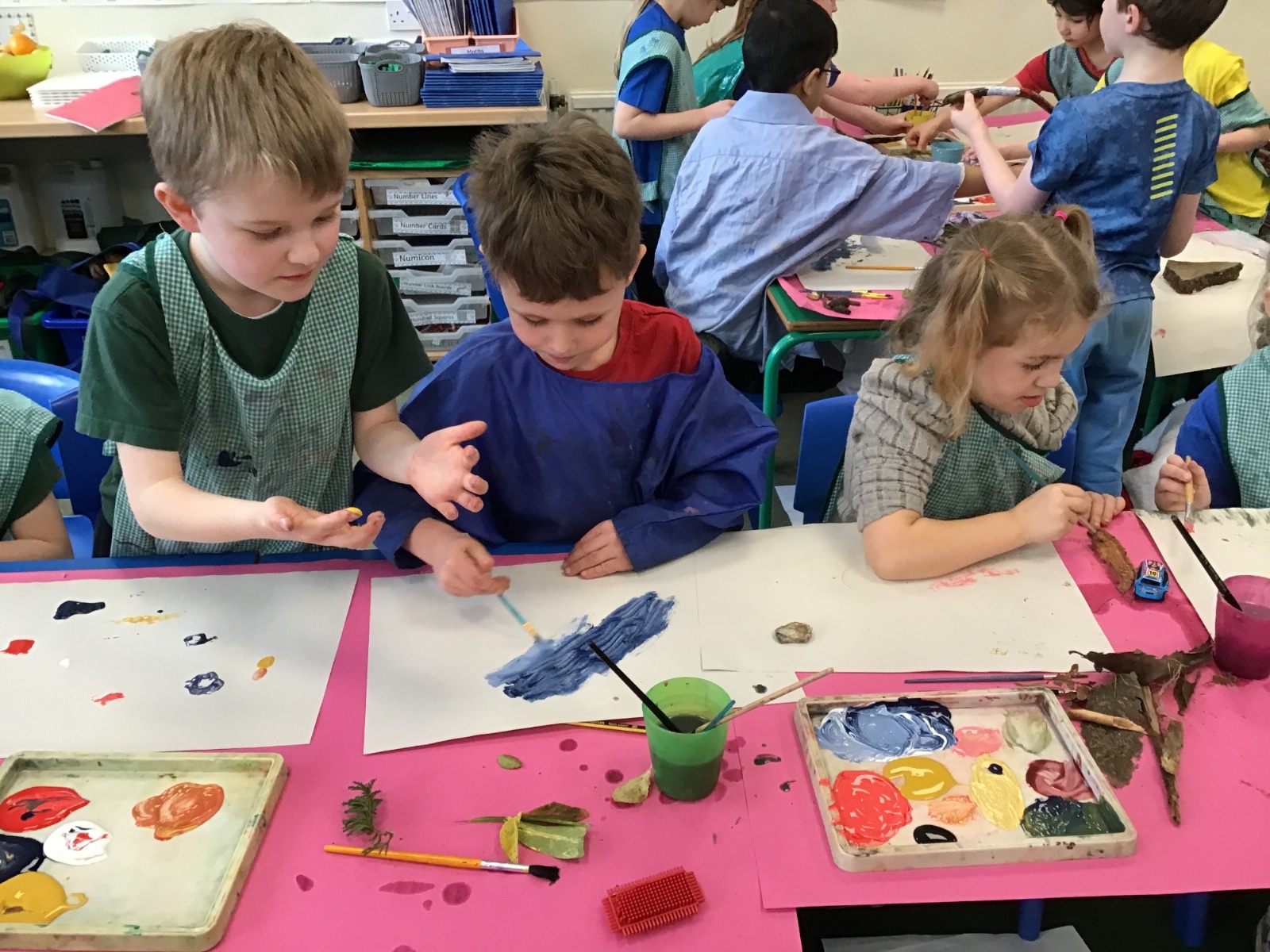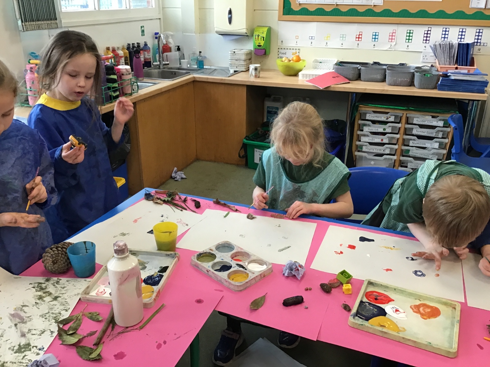 Today, Apple Class have been creating their artwork. They have used the work of Alex Artiste Pientre as inspiration, who uses everyday objects to print her backgrounds and then create real life paintings of animals in the background. Apple Class went on a hunt outside to find natural objects they could print. Then they painted their animals before mounting them.