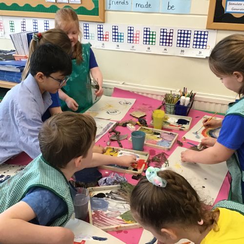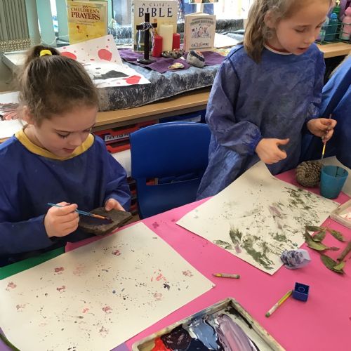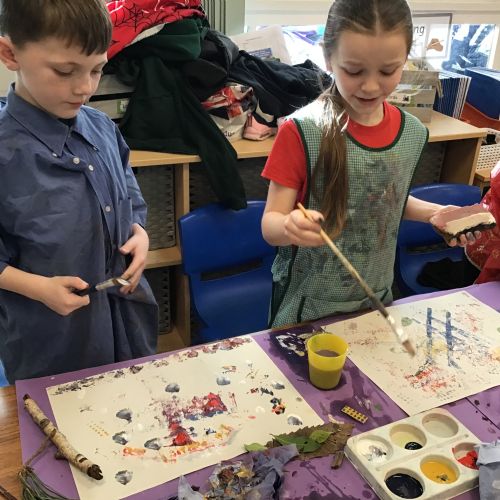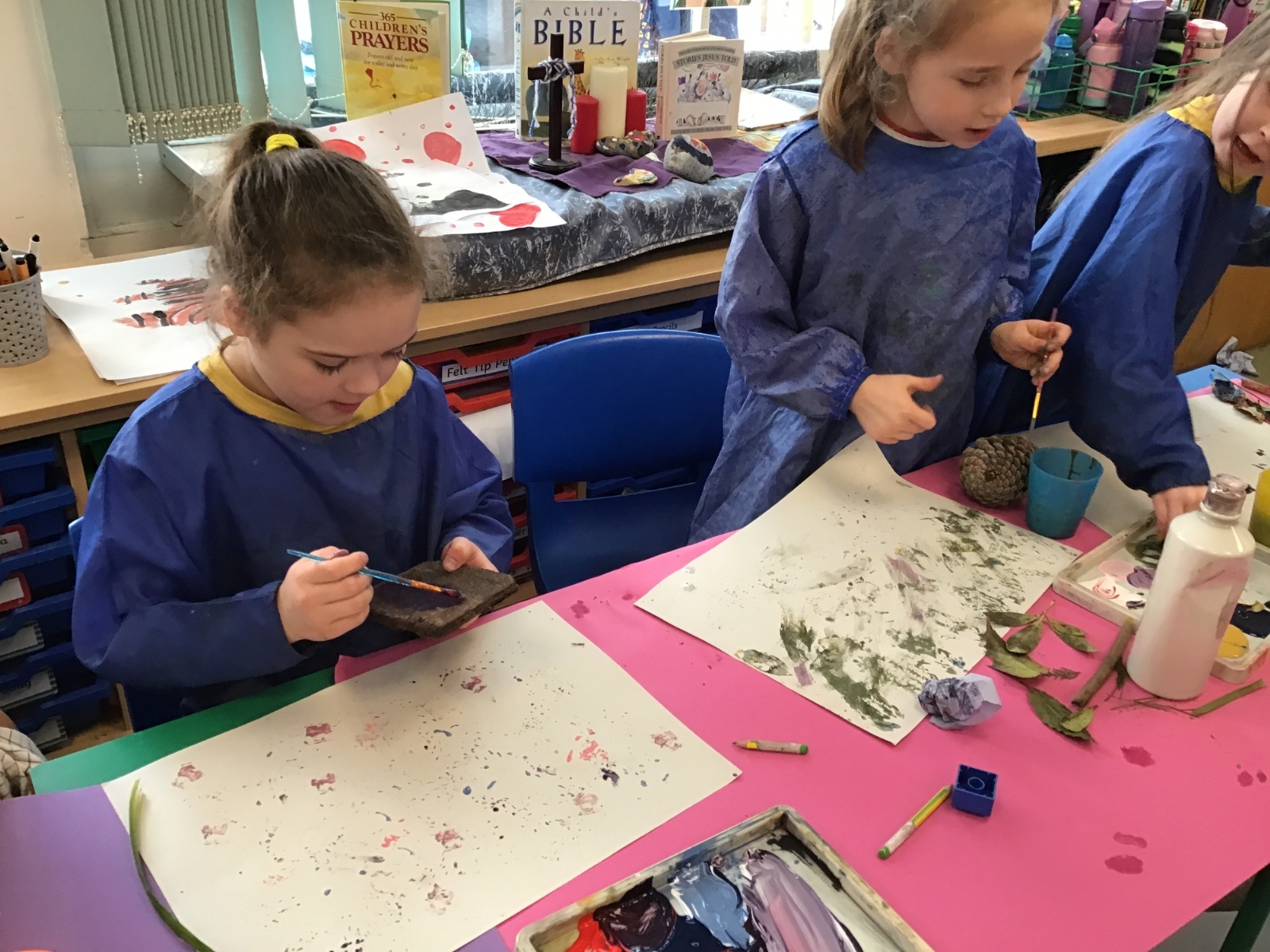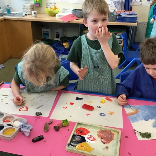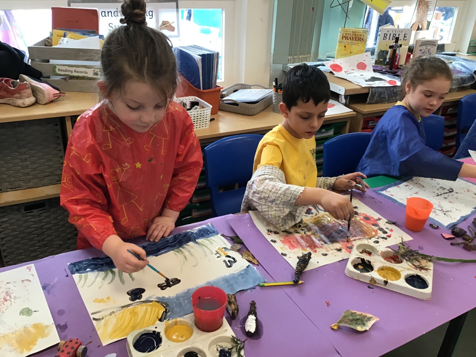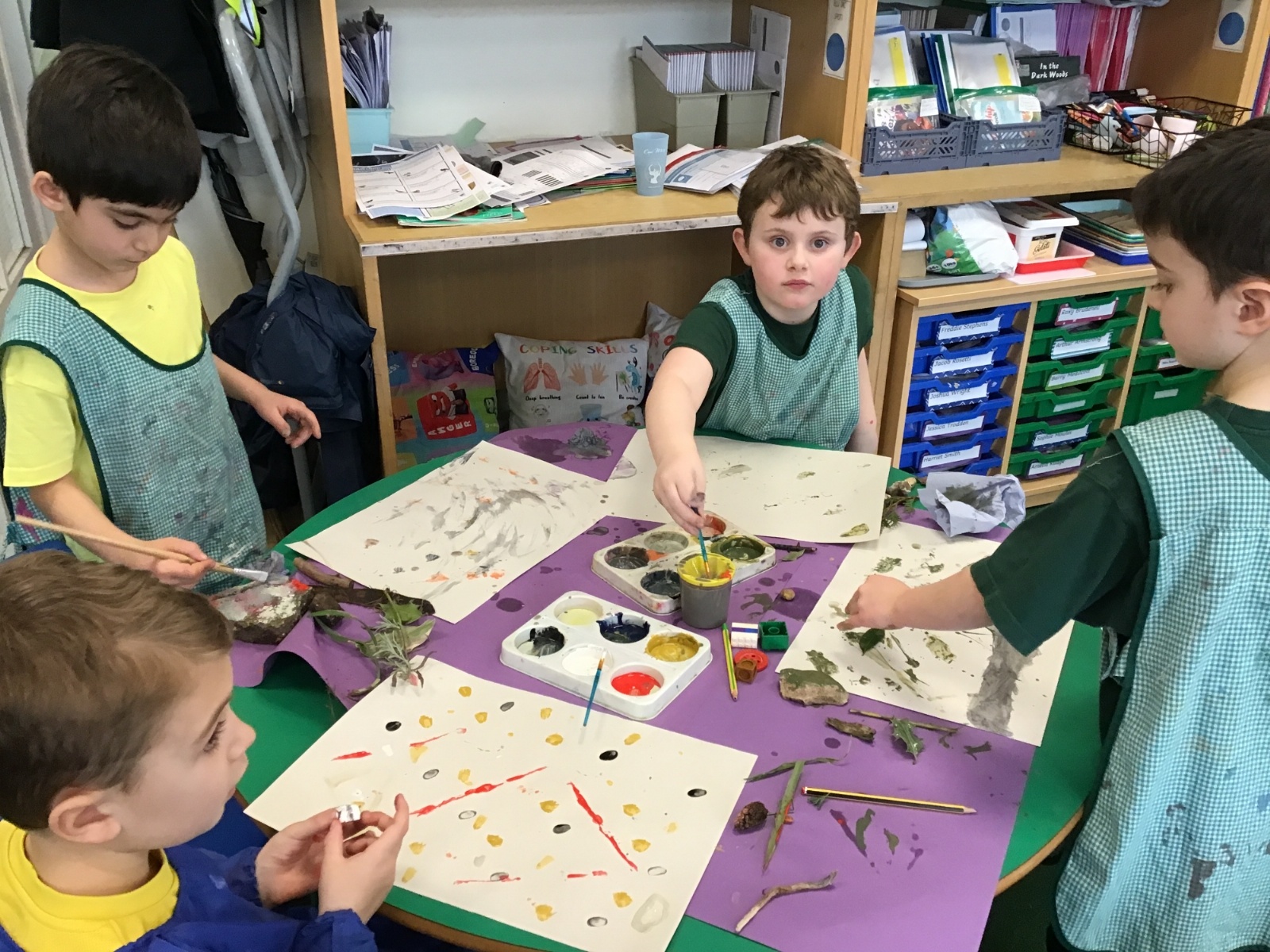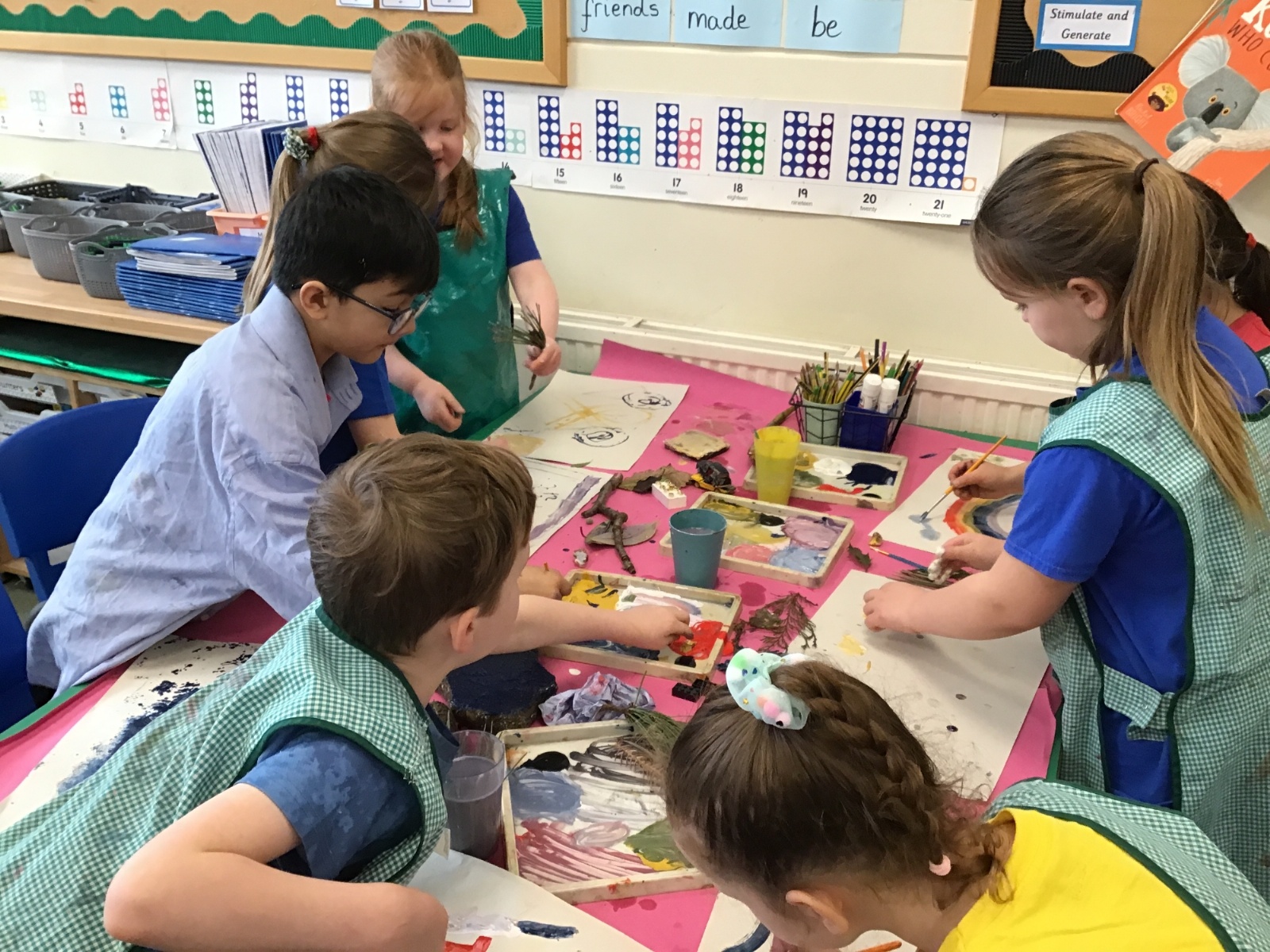 Today, Apple Class have been creating their artwork. They have used the work of Alex Artiste Pientre as inspiration, who uses everyday objects to print her backgrounds and then create real life paintings of animals in the background. Apple Class went on a hunt outside to find natural objects they could print. Then they painted their animals before mounting them.