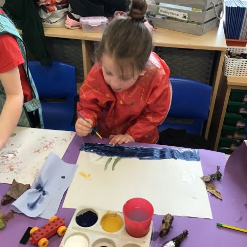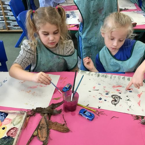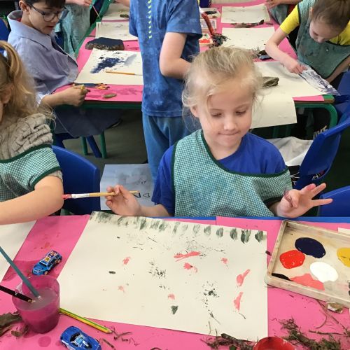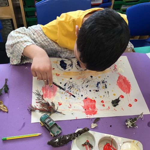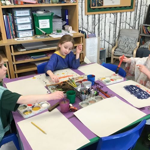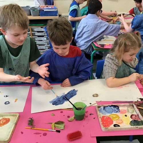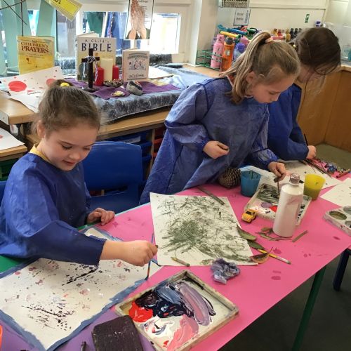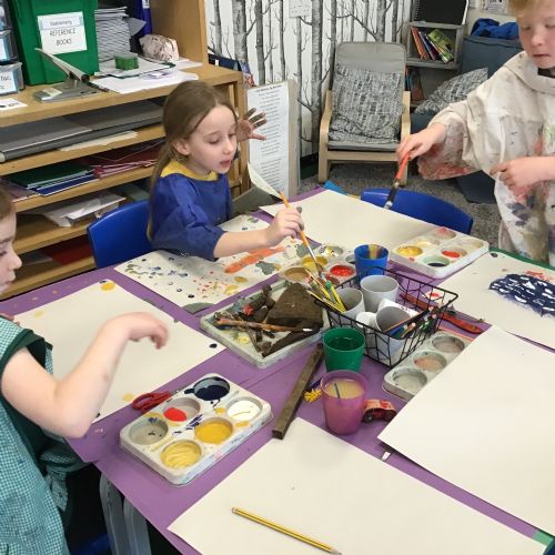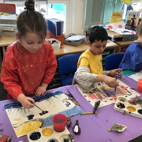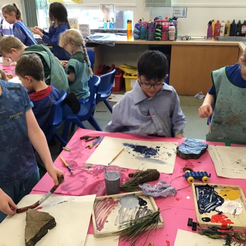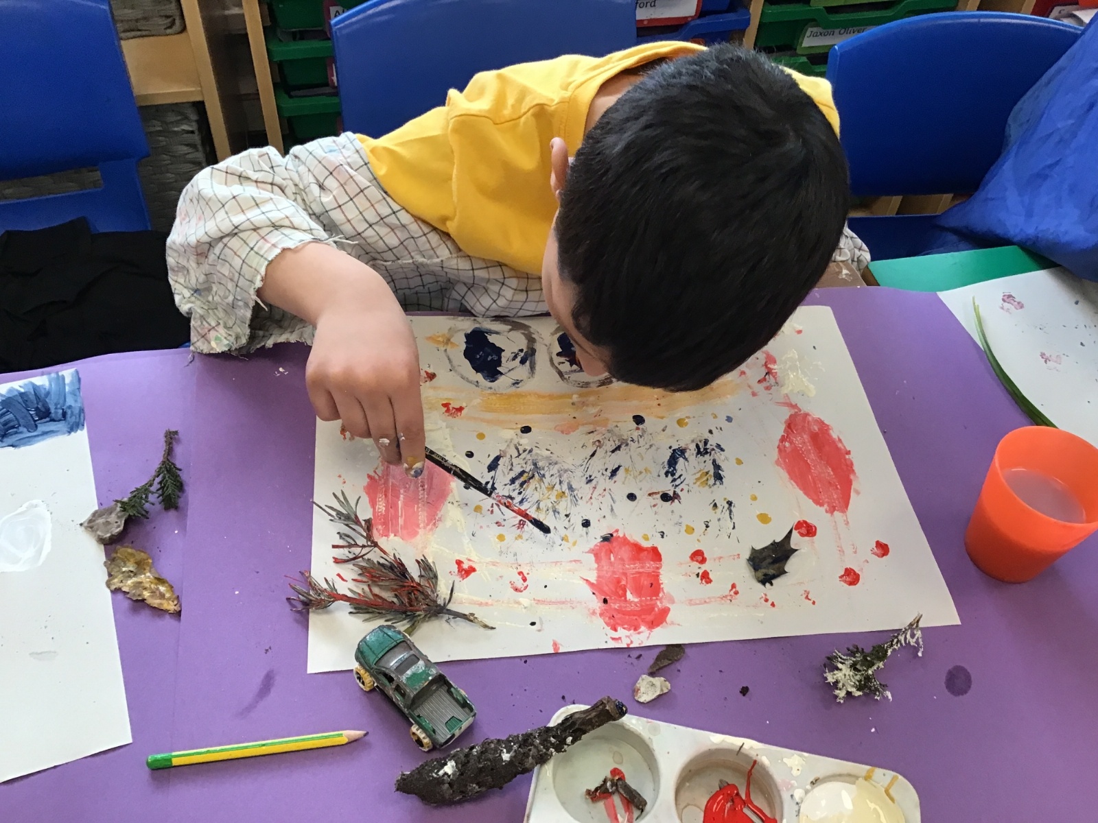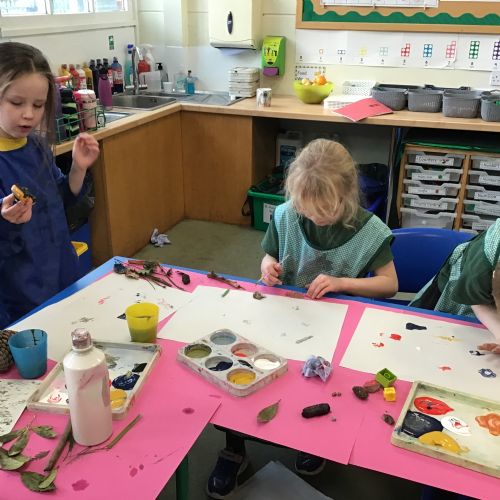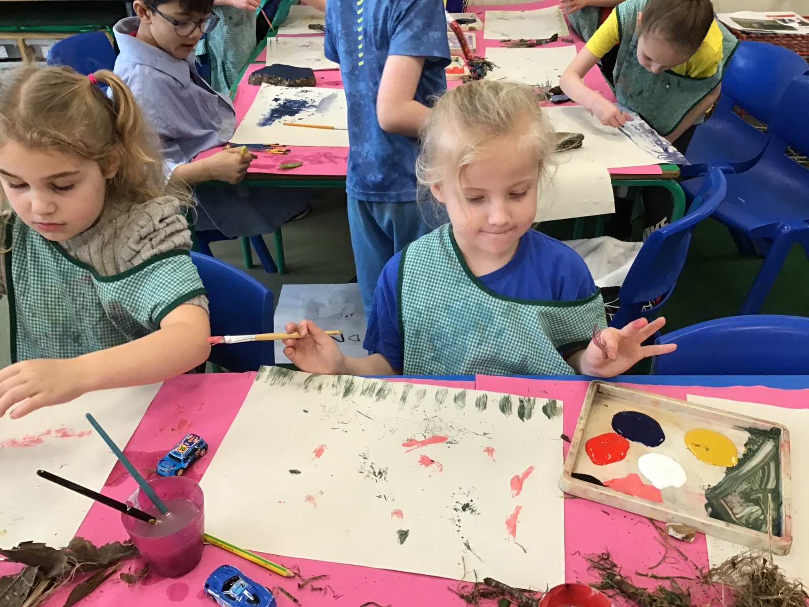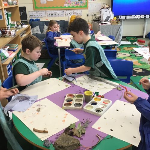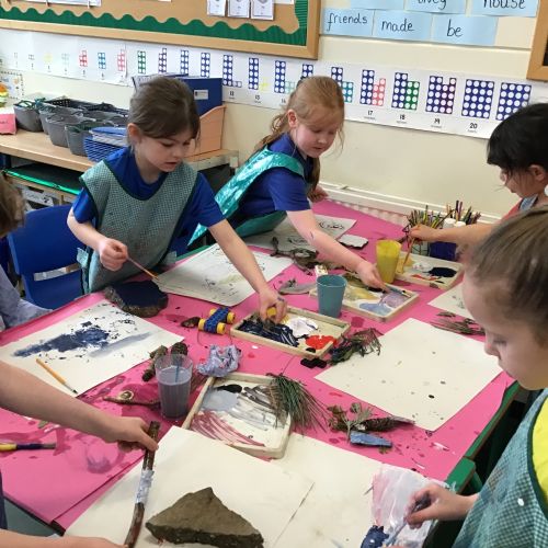 Today, Apple Class have been creating their artwork. They have used the work of Alex Artiste Pientre as inspiration, who uses everyday objects to print her backgrounds and then create real life paintings of animals in the background. Apple Class went on a hunt outside to find natural objects they could print. Then they painted their animals before mounting them.